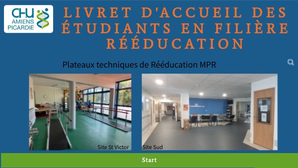 Ce livret intéractif s'adresse à l'ensemble des étudiants paramédicaux en filière de rééducation : Masseur-Kinésithérapeutes, Ergothérapeutes, Orthophonie, Psychomotricité, Pédicurie-Podologie et Activités Physiques Adaptées. L'équipe du plateau technique MPR est heureuse de vous accueillir en stage et de vous faire découvrir les spécialités développées au CHU Amiens-Picardie.