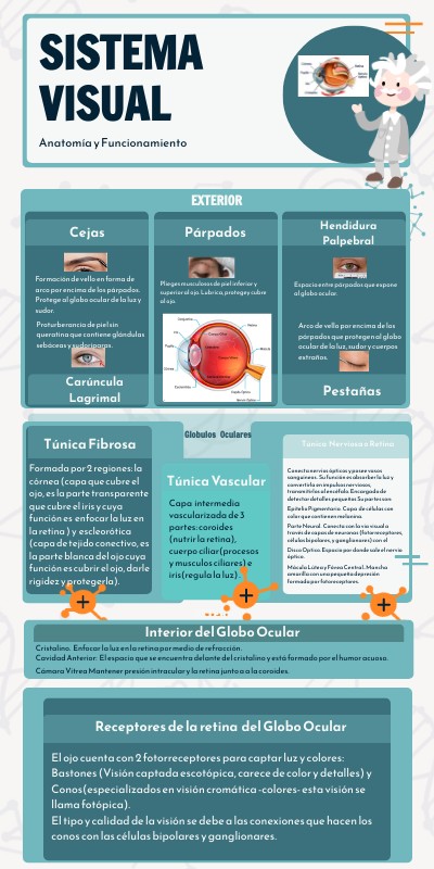 Conecta nervios ópticos y posee vasos sanguíneos. Su función es absorber la luz y convertirla en impulsos nerviosos, transmitirlos al encéfalo. Encargado de detectar detalles pequeños Su partes son:Epitelio Pigmentario. Capa de células con color que contienen melanina. Parte Neural. Conecta con la via visual a través de capas de neuronas (fotorreceptores, células bipolares, y ganglionares) con el Disco Optico. Espacio por donde sale el nervio óptico. Mácula Lútea y Fóvea Central.. Mancha amarilla con una pequeña depresión formada por fotoreceptores.