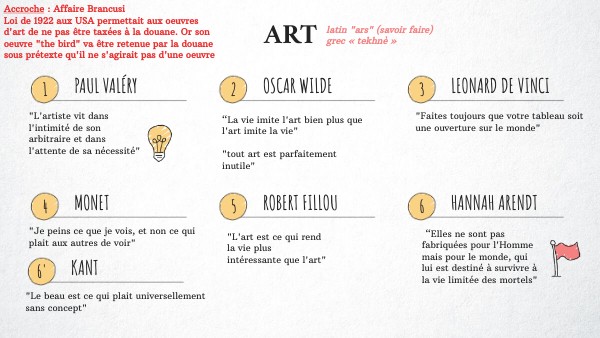 Définition : - Production concrète de beauté - Effort de réinvention - Tableaux dans un musée - Un accès au divin - Un moyen de donner sens à la vie ? ou "un luxe mensonger" Camus 1. L'art précédé par la technique - L'oeuvre suit des règles de fabrication mais n'a pas de règles d'utilisation. Ne peut être ni jetée, ni usée ni consommée. Dépasse l'éfficace et le concret. - Un détournement du savoir faire - Moyen de rémémoration, un vecteur de temporalité = Hannah Arendt 2. Le rôle de l'artiste entre mensonge et vérité - Une séléction de l'imitation pour créer une expérience de séduction = Poétique d'Aristote -Art relève du beau si l'oeuvre reproduit le réel = Réalisme 19 ème (artiste jugé sur sa capacité technique) "Mimesis"grec. Platon dira que cette reproduction n'a pas de sens dès lors qu'elle n'est plus dans le monde intelligible - Rester fidèle ou instaurer un aspect lyrique ? Le courant des Romantiques = Reproche de Platon à Homère - Imiter la nature au profit d'une subjectivité profonde 3. Autonomie du champ artistique - La modernité, créer un lien étrange avec son époque = Procès de Baudelaire - Casser les codes du beau = Art moderne comme expression de la liberté : Jean Dubuffet, les ready made de Marcel Duchamp, aspirateur sous plexiglas de Jeff Koons