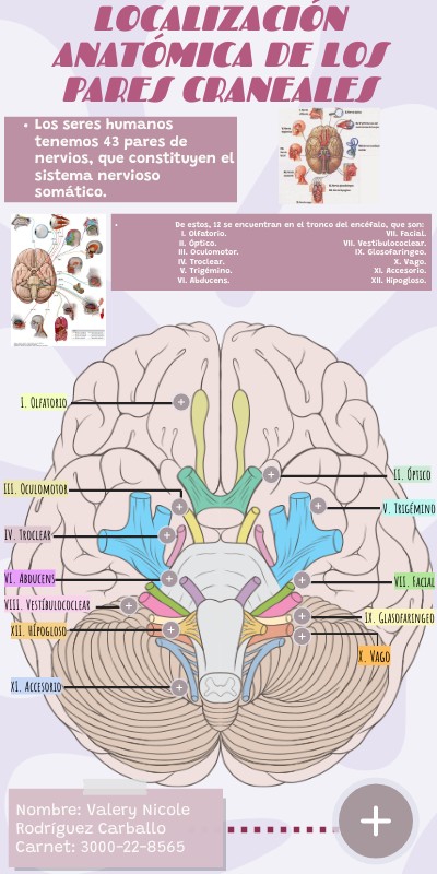 I. Olfatorio. VII. Facial.II. Óptico. VII. Vestíbulococlear. III. Oculomotor. IX. Glosofaringeo. IV. Troclear. X. Vago. V. Trigémino. XI. Accesorio. VI. Abducens. XII. Hípogloso.