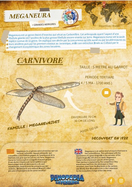 Meganeura is an extinct kind of insects that lived in the Carboniferous. This arthropod with the appearance of a giant dragony is the ancestor of the largest dragony still alive on earth. Meganeura monyi is the only known species of this genus. Their decline is explained by the competition they would have had from the pterosaurs or their ancestors, then from the rst birds in the Jurassic, and nally their nal extinction in the Cretaceous by the ecosystem change of the lake areas.