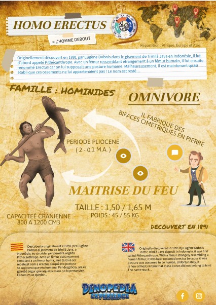 Originellement découvert en 1891 par Eugène Dubois dans le gisement de Trinilà Java en Indonésie, il fut d’abord appelé Pithécanthrope. Avec un fémur ressemblant étrangement à un fémur humain, il fut ensuite renommé Erectus car on lui supposait une posture humaine. Malheureusement, il est maintenant quasi établi que ces ossements ne lui appartenaient pas ! Le nom est resté…