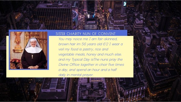 You may noice me I am fair-skinned, brown hair im 56 years old 6'2 I wear a veil my food is pastry, rice and vegetable meals, honey and much else. and my Typical Day isThe nuns pray the Divine Office together in choir five times a day, and spend an hour and a half daily in mental prayer.