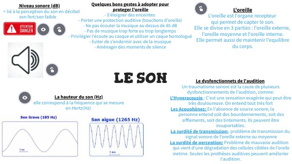 Le dysfonctionnets de l'audition Un traumatisme sonore est la cause de plusieurs dysfonctionnements de l'audition, comme: L'Hyperacousie : C'est une sensation exagérée qui peut être très douloureuse. On entend tout très fort Les Acouphènes: En l'absence de source sonore, la personne entend soit des bourdonnements, soit des sifflements, soit des tintements. Ils peuvent être insuportables. La surdité de transmission: problème de transmission du signal sonore de l'oreille externe ou moyenne La surdité de perception: Problème de mauvaise audition qui vient d'une dégradation des cellules ciblées de l'oreile inetrne. Seules les prothèses auditives peuvent amélorier l'audition.