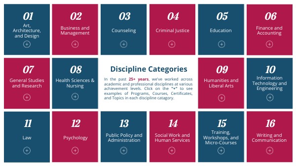 In the past 25+ years, we've worked across academic and professional disciplines at various achievement levels. Click on the "+" to see examples of Programs, Courses, Certificates, and Topics in each discipline catagory.