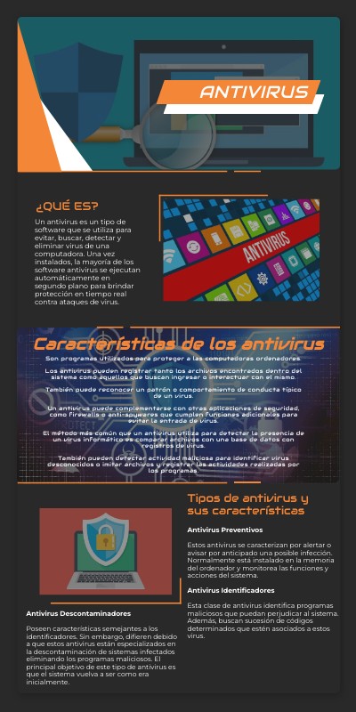 Son programas utilizados para proteger a las computadoras ordenadores.Los antivirus pueden registrar tanto los archivos encontrados dentro del sistema como aquellos que buscan ingresar o interactuar con el mismo.También puede reconocer un patrón o comportamiento de conducta típico de un virus.Un antivirus puede complementarse con otras aplicaciones de seguridad, como firewalls o anti-spywares que cumplen funciones adicionales para evitar la entrada de virus.El método más común que un antivirus utiliza para detectar la presencia de un virus informático es comparar archivos con una base de datos con registros de virus.También pueden detectar actividad maliciosa para identificar virus desconocidos o imitar archivos y registrar las actividades realizadas por los programas.