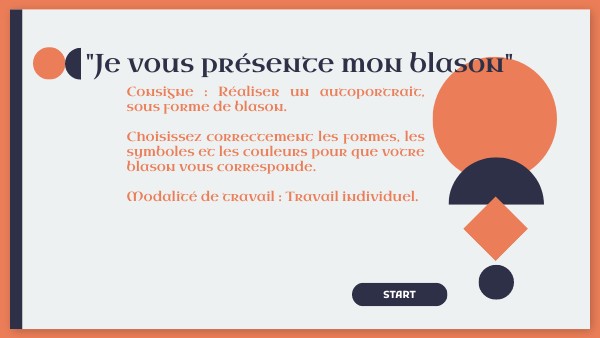 Consigne : Réaliser un autoportrait, sous forme de blason. Choisissez correctement les formes, les symboles et les couleurs pour que votre blason vous corresponde. Modalité de travail : Travail individuel.
