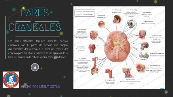 Los pares craneales, también llamados nervios craneales, son 12 pares de nervios que surgen directamente del cerebro o a nivel del tronco del encéfalo para distribuirse a través de los agujeros de la base del cráneo en la cabeza, cuello, tórax y abdomen.