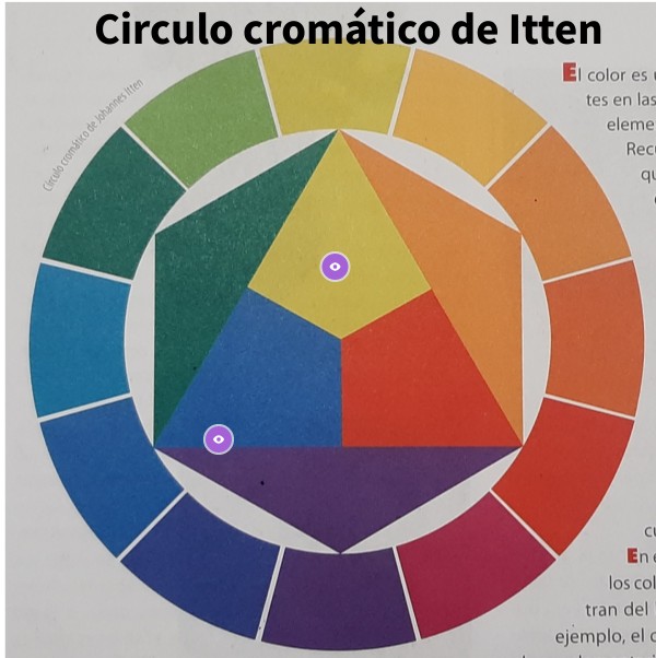 En esta imagen se dan los nombres de los colores que componen el círculo cromático de Itten (primarios, secundarios y terciarios)