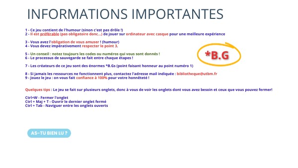 1 - Ce jeu contient de l'humour (sinon c'est pas drôle !) 2 - Il est préférable (pas obligatoire donc...) de jouer sur ordinateur avec casque pour une meilleure expérience 3 - Vous avez l'obligation de vous amuser ! (humour) 4 - Vous devez impérativement respecter le point 3. 5 - Un conseil : notez toujours les codes ou numéros qui vous sont donnés ! 6 - Le processus de sauvegarde se fait entre chaque étapes ! 7 - Les créateurs de ce jeu sont des énormes *B.Gs (point faisant honneur au point numéro 1)8 - Si jamais les ressources ne fonctionnent plus, contactez l'adresse mail indiquée : bibliotheque@utbm.fr9 - Jouez le jeu : on vous fait confiance à 100% pour votre honnêteté ! Quelques tips : Le jeu se fait sur plusieurs onglets, donc à vous de voir les onglets dont vous avez besoin et ceux que vous pouvez fermer! Ctrl+W - Fermer l'onglet Ctrl + Maj + T - Ouvrir le dernier onglet fermé Ctrl + Tab - Naviguer entre les onglets ouverts