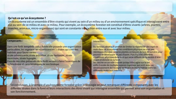 En conclusion, à l’exemple d’un écosystème forestier grâce à l'écologie on peut remarquer différents composants avec les diffentes strates dans la foret et leurs interactions des êtres vivant qui interagise ensemble qui permet ainsi son organisation et son fonctionnement.