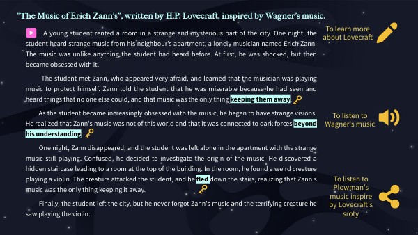 A young student rented a room in a strange and mysterious part of the city. One night, the student heard strange music from his neighbour’s apartment, a lonely musician named Erich Zann. The music was unlike anything the student had heard before. At first, he was shocked, but then became obsessed with it. The student met Zann, who appeared very afraid, and learned that the musician was playing music to protect himself. Zann told the student that he was miserable because he had seen and heard things that no one else could, and that music was the only thing keeping them away. As the student became increasingly obsessed with the music, he began to have strange visions. He realized that Zann's music was not of this world and that it was connected to dark forces beyond his understanding. One night, Zann disappeared, and the student was left alone in the apartment with the strange music still playing. Confused, he decided to investigate the origin of the music. He discovered a hidden staircase leading to a room at the top of the building. In the room, he found a weird creature playing a violin. The creature attacked the student, and he fled down the stairs, realizing that Zann's music was the only thing keeping it away. Finally, the student left the city, but he never forgot Zann's music and the terrifying creature he saw playing the violin.