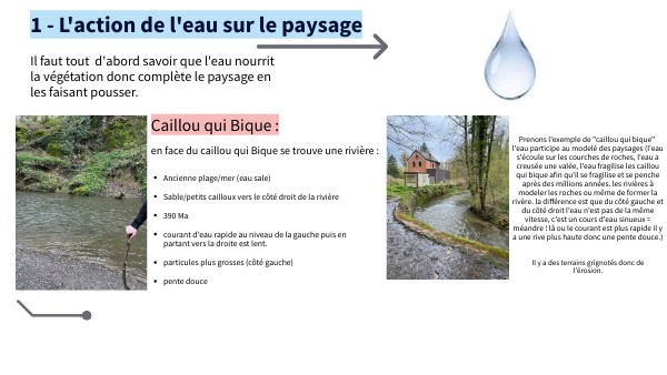 Prenons l'exemple de "caillou qui bique" l'eau participe au modelé des paysages (l'eau s'écoule sur les courches de roches, l'eau a creusée une valée, l'eau fragilise les caillou qui bique afin qu'il se fragilise et se penche après des millions années. les rivières à modeler les roches ou même de former la rivère. la différence est que du côté gauche et du côté droit l'eau n'est pas de la même vitesse, c'est un cours d'eau sinueux = méandre ! là ou le courant est plus rapide il y a une rive plus haute donc une pente douce.)