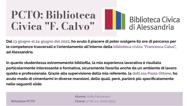 Dal 13 giugno al 24 giugno del 2022, ho avuto il piacere di poter svolgere 62 ore di percorso per le competenze trasversali e l'orientamento all'interno della biblioteca civica "Francesca Calvo", ad Alessandria.In quanto studentessa estremamente bibliofila, la mia esperienza lavorativa è risultata particolarmente interessante e formativa, sicuramente favorita anche da un ambiente di lavoro quieto e professionale. Grazie alla supervisione della mia referente, la dott.ssa Paola Ottone, ho avuto modo di cimentarmi in diverse mansioni, delle quali, però, parlerò più specificatamente nelle seguenti slide.