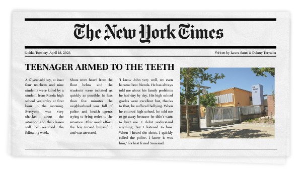 A 17-year-old boy, at least four teachers and nine students were killed by a student from Ronda high school yesterday at first hour in the morning. Everyone was very shocked about the situation and the classes will be resumed the following week.