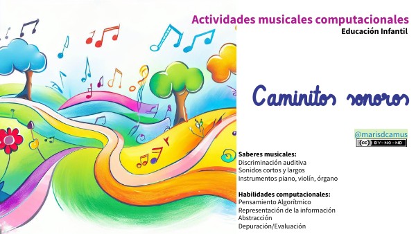 Saberes musicales: Discriminación auditiva Sonidos cortos y largos Instrumentos piano, violín, órgano Habilidades computacionales: Pensamiento Algorítmico Representación de la información Abstracción Depuración/Evaluación