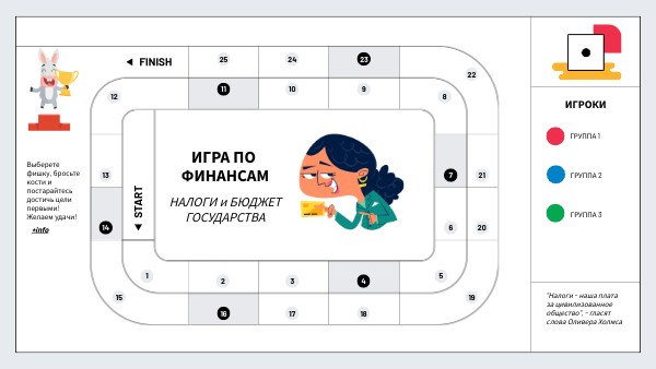 Выберете фишку, бросьте кости и постарайтесь достичь цели первыми!Желаем удачи!