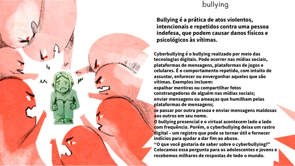 Cyberbullying é o bullying realizado por meio das tecnologias digitais. Pode ocorrer nas mídias sociais, plataformas de mensagens, plataformas de jogos e celulares. É o comportamento repetido, com intuito de assustar, enfurecer ou envergonhar aqueles que são vítimas. Exemplos incluem: espalhar mentiras ou compartilhar fotos constrangedoras de alguém nas mídias sociais; enviar mensagens ou ameaças que humilham pelas plataformas de mensagens; se passar por outra pessoa e enviar mensagens maldosas aos outros em seu nome. O bullying presencial e o virtual acontecem lado a lado com frequência. Porém, o cyberbullying deixa um rastro digital – um registro que pode se tornar útil e fornecer indícios para ajudar a dar fim ao abuso. “O que você gostaria de saber sobre o cyberbullying?” Colocamos essa pergunta para os adolescentes e jovens e recebemos milhares de respostas de todo o mundo.
