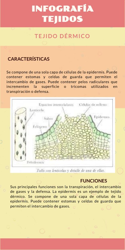 Sus principales funciones son la transpiración, el intercambio de gases y la defensa. La epidermis es un ejemplo de tejido dérmico. Se compone de una sola capa de células de la epidermis. Puede contener estomas y celdas de guarda que permiten el intercambio de gases.
