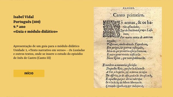 Apresentação de um guia para o módulo didático Unidade 3, «Texto narrativo em verso» - Os Lusíadas e outros textos, onde se insere o estudo do episódio de Inês de Castro (Canto III)