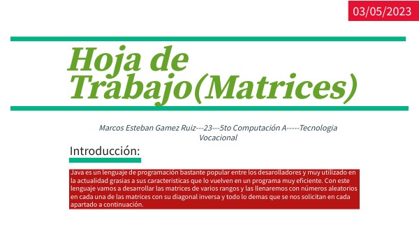 Java es un lenguaje de programación bastante popular entre los desarolladores y muy utilizado en la actualidad grasias a sus caracteristicas que lo vuelven en un programa muy eficiente. Con este lenguaje vamos a desarrollar las matrices de varios rangos y las llenaremos con números aleatorios en cada una de las matrices con su diagonal inversa y todo lo demas que se nos solicitan en cada apartado a continuación.