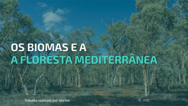 Os biomas são grandes espaços geográficos que apresentam características físicas, biológicas e climáticas. A Floresta Mediterrânea é constituída por árvores e arbustos de folha perene adaptada ao calor. A folha perene é visivél nos sobreiros nas oliveiras e nas azinheiras.