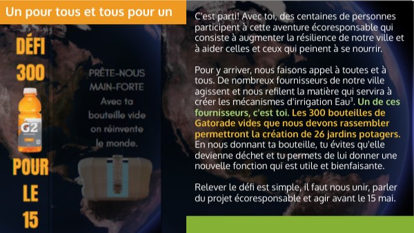 C'est parti! Avec toi, des centaines de personnes participent à cette aventure écoresponsable qui consiste à augmenter la résilience de notre ville et à aider celles et ceux qui peinent à se nourrir. Pour y arriver, nous faisons appel à toutes et à tous. De nombreux fournisseurs de notre ville agissent et nous refilent la matière qui servira à créer les mécanismes d'irrigation Eau3. Un de ces fournisseurs, c'est toi. Les 300 bouteilles de Gatorade vides que nous devons rassembler permettront la création de 26 jardins potagers. En nous donnant ta bouteille, tu évites qu'elle devienne déchet et tu permets de lui donner une nouvelle fonction qui est utile et bienfaisante. Relever le défi est simple, il faut nous unir, parler du projet écoresponsable et agir avant le 15 mai.