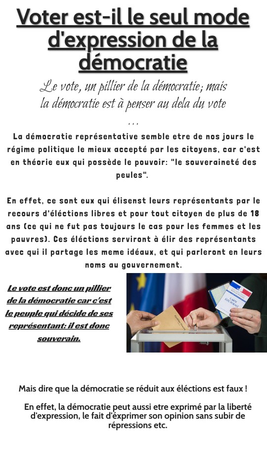 Mais dire que la démocratie se réduit aux éléctions est faux !En effet, la démocratie peut aussi etre exprimé par la liberté d'expression, le fait d'éxprimer son opinion sans subir de répressions etc.
