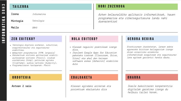Etorkizunean ikasketetan, lanean edota eguneroko bizitzan baliagarriak izango diren oinarrizko erreminta informatikoak ezagutzeak eta segurtasunez lana egiteak garrantzi handia dauka.