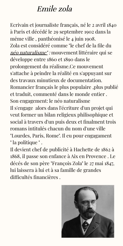 Ecrivain et journaliste français, né le 2 avril 1840 à Paris et décédé le 29 septembre 1902 dans la même ville , panthéonisé le 4 juin 1908.Zola est considéré comme "le chef de la file du néo naturalisme" : mouvement littéraire qui se développe entre 1860 et 1890 dans le prolongement du réalisme.Ce mouvement s'attache à peindre la réalité en s'appuyant sur des travaux minutieux de documentation.Romancier français le plus populaire ,plus publié et traduit, commenté dans le monde entier .Son engagement: le néo naturalisme Il s'engage alors dans l'écriture d'un projet qui veut former un bilan religieux philisophique et social à travers d'un puis deux et finalment trois romans intitulés chacun du nom d'une ville "Lourdes, Paris, Rome". Il eu pour engagament " la politique " .Il devient chef de publicité à Hachette de 1862 à 1868, il passe son enfance à Aix en Provence . Le décés de son père "François Zola" le 27 mai 1847, lui laissera à lui et à sa famille de grandes difficultés financières .