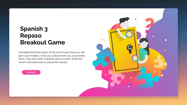 Complete the three tasks. At the end of each task you will get a set of letters. Once you collect them all, unscramble them. They will make a Spanish word (a color). Enter the word in all lowercase to unlock the reward.