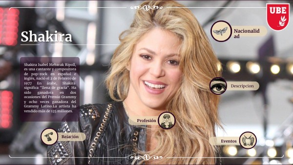 Shakira Isabel Mebarak Ripoll, es una cantante y compositora de pop-rock en español e inglés, nació el 2 de Febrero de 1977 En árabe, Shakira significa "llena de gracia". Ha sido ganadora en dos ocasiones del Premio Grammy y ocho veces ganadora del Grammy Latino.La artista ha vendido más de 135 millones.
