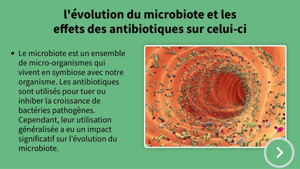 - Le microbiote est un ensemble de micro-organismes qui vivent en symbiose avec notre organisme. Les antibiotiques sont utilisés pour tuer ou inhiber la croissance de bactéries pathogènes. Cependant, leur utilisation généralisée a eu un impact significatif sur l'évolution du microbiote.