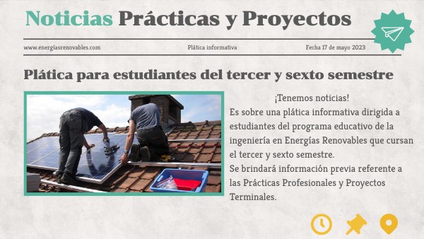 ¡Tenemos noticias!Es sobre una plática informativa dirigida a estudiantes del programa educativo de la ingeniería en Energías Renovables que cursan el tercer y sexto semestre.Se brindará información previa referente a las Prácticas Profesionales y Proyectos Terminales.