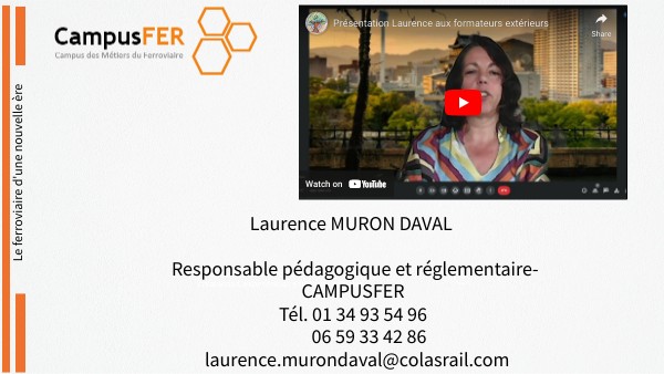 Laurence MURON DAVAL Responsable pédagogique et réglementaire- CAMPUSFER Tél. 01 34 93 54 96 06 59 33 42 86 laurence.murondaval@colasrail.com