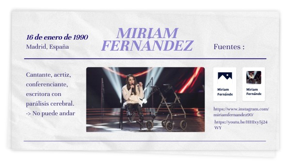 Cantante, acrtiz, conferenciante, escritora con parálisis cerebral. -> No puede andar