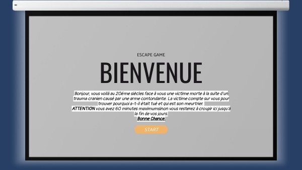Bonjour, vous voilà au 20éme siècles face à vous une victime morte à la suite d'un trauma cranien causé par une arme contondante. La victime compte sur vous pour trouver pourquoi a-t-il était tué et qui est son meurtrier. ATTENTION vous avez 60 minutes maximumsinon vous resterez à croupir ici jusqu'à la fin de vos jours. Bonne Chance.