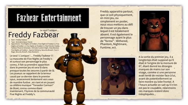 Le seul ! L'unique ! ... Freddy Fazbear !!! La mascotte de Five Nights at Freddy's et surtout son personnage le plus connu, Il fait sa première apparition dans le premier jeu et sera là dans presque toutes les oeuvres à partir de là. Les joueurs se rappelent de la terreur causé par ce dernier dans le premier opus, avancement lentement vers vous de manière furtive , en riant et en jouant sa célèbre musique "Toreador Carmen" de Bizet, connu comme étant maintenant, l'hymne de la communauté Five Nights at Freddy's.