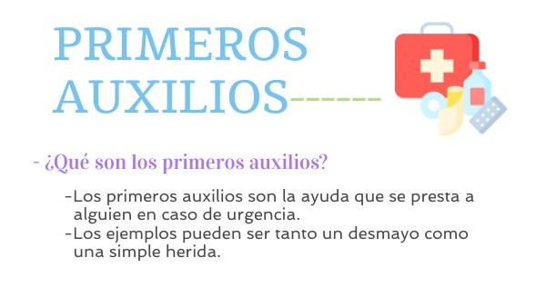-Los primeros auxilios son la ayuda que se presta a alguien en caso de urgencia. -Los ejemplos pueden ser tanto un desmayo como una simple herida.
