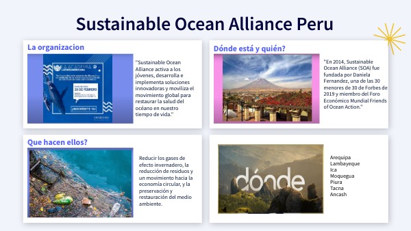 "En 2014, Sustainable Ocean Alliance (SOA) fue fundada por Daniela Fernandez, una de las 30 menores de 30 de Forbes de 2019 y miembro del Foro Económico Mundial Friends of Ocean Action."