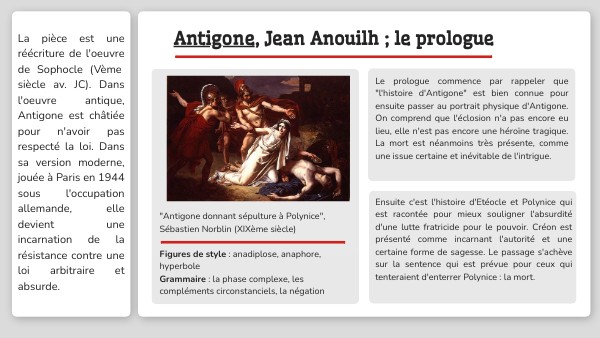 "Antigone donnant sépulture à Polynice", Sébastien Norblin (XIXème siècle) Figures de style : anadiplose, anaphore, hyperbole Grammaire : la phase complexe, les compléments circonstanciels, la négation