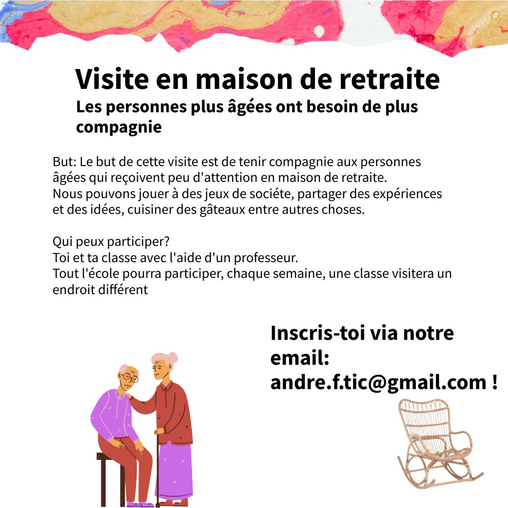 But: Le but de cette visite est de tenir compagnie aux personnes âgées qui reçoivent peu d'attention en maison de retraite.Nous pouvons jouer à des jeux de sociéte, partager des expériences et des idées, cuisiner des gâteaux entre autres choses. Qui peux participer?Toi et ta classe avec l'aide d'un professeur. Tout l'école pourra participer, chaque semaine, une classe visitera un endroit différent