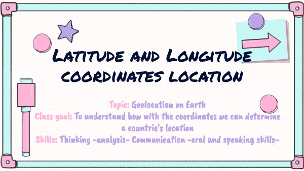 Topic: Geolocation on Earth Class goal: To understand how with the coordinates we can determine a countrie's location Skills: Thinking -analysis- Communication -oral and speaking skills-