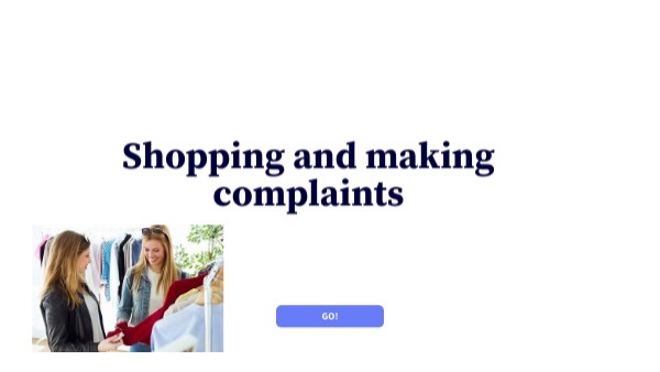 C. Speaking - shopping for clothes. In pairs, build up the dialogue. Follow the prompts Shop assistant: Chiedi se ha bisogno di aiuto; Customer: Rispondi che stai cercando un vestito elegante. Chiedi se puoi provare il vestito. Shop assistant: Rispondi di si (sure) chiedi quanti articoli (items) deve provare Customer : Rispondi che devi provare solo il vestito e la camicetta (blouse) Shop assistant: Dì che il camerino n. 3 è libero, può provare lì. Customer: Dì che la camicia è larga sulle spalle. Chiedi di poter provare una taglia in meno. Shop assistant: Chiedi che taglia sta provando /indossando (are you trying on /are you wearing) Customer: Rispondi la taglia medium, vorresti provare la small Shop assistant: Dì che è terminata ( it’s sold out) Customer: Chiedi il prezzo della camicia Shop assistant: Rispondi che è scontata del 50 % (it’s half price) Customer: Dì che è un affare (it’s a bargain!)