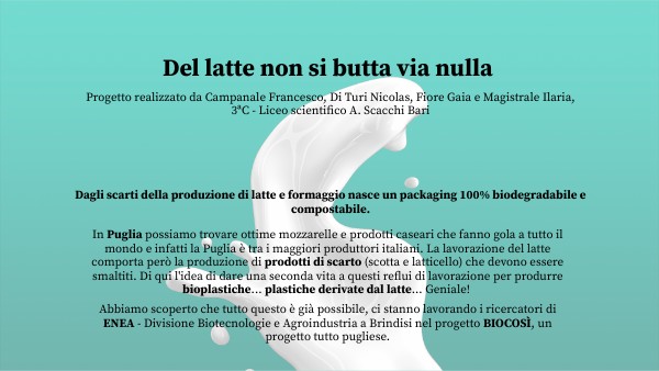 In Puglia possiamo trovare ottime mozzarelle e prodotti caseari che fanno gola a tutto il mondo e infatti la Puglia è tra i maggiori produttori italiani. La lavorazione del latte comporta però la produzione di prodotti di scarto (scotta e latticello) che devono essere smaltiti. Di qui l'idea di dare una seconda vita a questi reflui di lavorazione per produrre bioplastiche... plastiche derivate dal latte... Geniale! Abbiamo scoperto che tutto questo è già possibile, ci stanno lavorando i ricercatori di ENEA - Divisione Biotecnologie e Agroindustria a Brindisi nel progetto BIOCOSÌ, un progetto tutto pugliese.