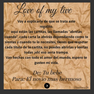 Voy a explicarle de que se trata este regalito. aquí están las cartitas, las llamadas "abrelas cuando", cada carta la abrirás dependiendo como te sientas y cuando tu lo necesites, tienes que respetar cada título de la cartita, no puedes abrirlas y leerlas todas ¡eh! eso sería trampa. Van hechas con todo el amor del mundo, espero te gusten mi vida.