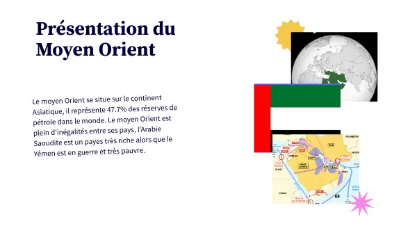 Le moyen Orient se situe sur le continent Asiatique, il représente 47.7% des réserves de pétrole dans le monde. Le moyen Orient est plein d'inégalités entre ses pays, l'Arabie Saoudite est un payes très riche alors que le Yémen est en guerre et très pauvre.