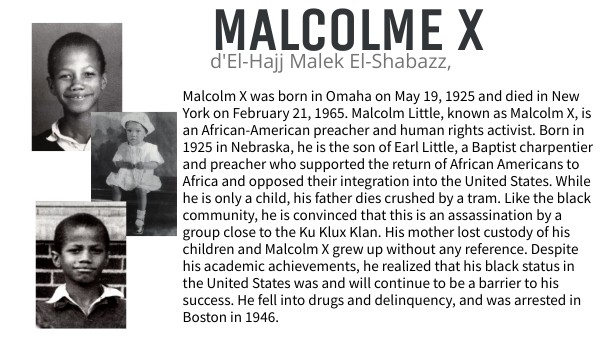 Malcolm X was born in Omaha on May 19, 1925 and died in New York on February 21, 1965. Malcolm Little, known as Malcolm X, is an African-American preacher and human rights activist. Born in 1925 in Nebraska, he is the son of Earl Little, a Baptist charpentier and preacher who supported the return of African Americans to Africa and opposed their integration into the United States. While he is only a child, his father dies crushed by a tram. Like the black community, he is convinced that this is an assassination by a group close to the Ku Klux Klan. His mother lost custody of his children and Malcolm X grew up without any reference. Despite his academic achievements, he realized that his black status in the United States was and will continue to be a barrier to his success. He fell into drugs and delinquency, and was arrested in Boston in 1946.