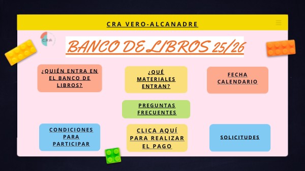 RENOVACIÓN: Se renueva automáticamente al abonar la cuota de 22€ en la fecha indicada, bien a la cuenta del centro ES29 2085 2073 16 0300229600 o en el enlace de TPV (página principal MÉTODO DE PAGO). Al renovar NO ES NECESARIO rellenar ningún documento, solo realizar el abono del dinero. ALTAS NUEVAS: Rellenar formulario de alta, envíar al centro (a través del correo craadahuesca@educa.aragon.es o entregándolo a los tutores) y abonar la cuota en la fecha indicada. BAJAS: Rellenar solicitud de baja. Todo el alumnado que ha sido usuario de banco de libros en el curso 2024-2025, están obligados a devolver los lotes en perfecto estado y completos que hayan usado durante este curso escolar.
