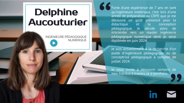 Forte d’une expérience de 7 ans en tant qu’ingénieure matériaux, c’est lors d'une année de préparation au CRPE que je me découvre un goût prononcé pour la didactique et la conception pédagogique. Je décide alors de m’orienter vers un master ingénierie pédagogique numérique dont je serai diplômée en juin 2024. Je suis actuellement à la recherche d'un poste d'ingénieure pédagogique ou de conceptrice pédagogique à compter de juillet 2024.Je vous invite à découvrir certains de mes travaux à travers ce e-portfolio.